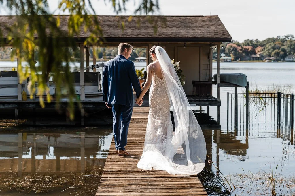 The backyard opens up to the lake and includes a shaded lanai and boat dock, which naturally became focal points throughout the day. With full trees blocking direct sun starting in the early afternoon, the property offered surprisingly ideal lighting for an outdoor ceremony and portraits.