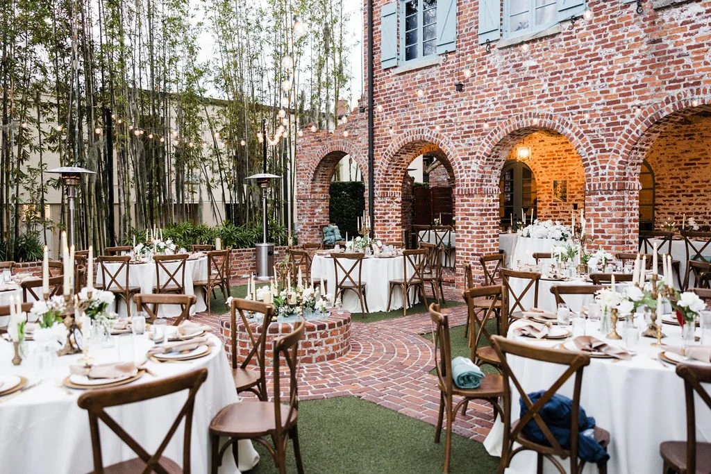 Your outdoor wedding ceremony is held in the romantic backyard of the historic home, in front of an antique wooden door set in a sweeping archway underneath a rustic timber balcony. With bright, Mediterranean-colored shutters, this backdrop needs no decorations! Guests are comfortably seated on venue-provided mahogany seats in the backyard, and after the wedding ceremony, they can enjoy cocktails in the intimate courtyard or indoor space (which also serves as a weather contingency with a capacity up to 70 guests).